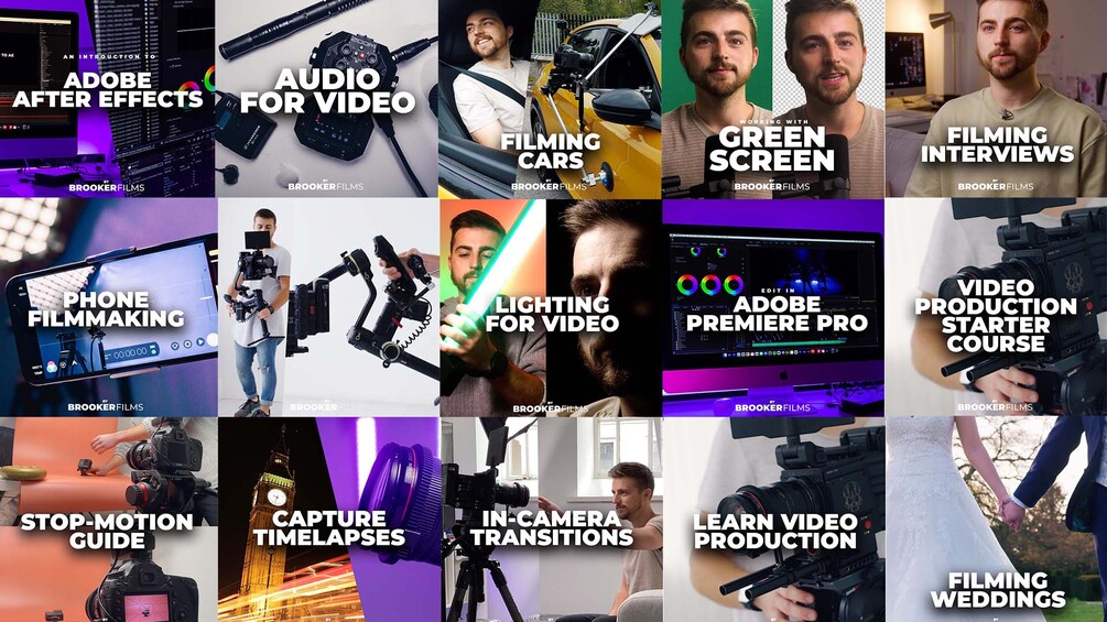 You will learn: Audio/Sound, Adobe After Effects, Adobe Premiere Pro, Camera Movement, Camera Settings, Composition & Framing, Filming an Interview, Filming with Cars/Vehicles, Green Screen, Lighting, Phone Filmmaking, Photography, Stop Motion, Timelapses & Hyperlapses, Transitions, Using a Gimbal, Wedding Filmmaking, YouTube Tips